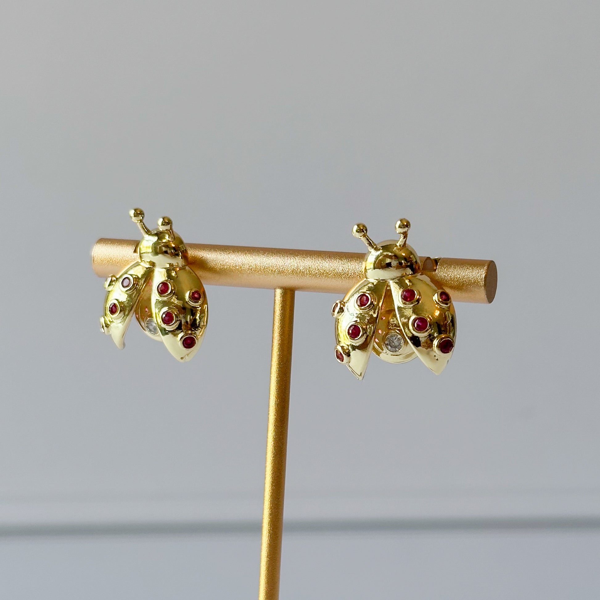 Golden ladybug studs with ruby-red accents and sparkling crystal details. Ruby Ladybug Earrings are chic, playful, and full of luck.