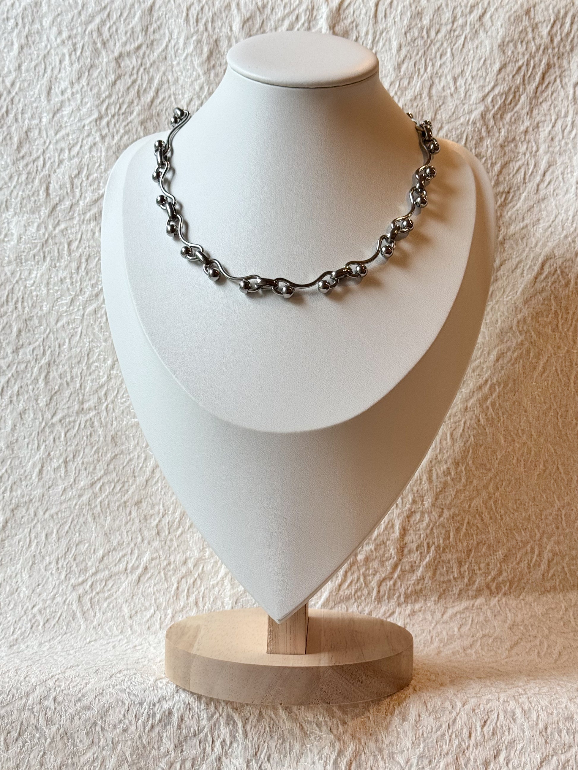 Minimalist silver-tone necklace featuring a fluid wave chain with polished bead details. Sleek, modern, and easy to style—perfect worn alone or layered for an effortless everyday look. ✨